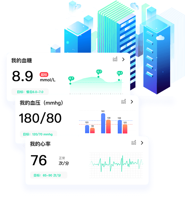 健康模塊,飽含血糖、血壓、尿酸、心率以及運(yùn)動健康指數(shù),為用戶提供數(shù)據(jù)云儲存、健康預(yù)警。系統(tǒng)還可根據(jù)用戶平時的檢測指數(shù),運(yùn)算出健康目標(biāo)值